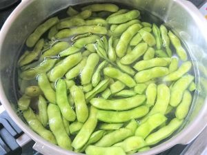 ⑥鍋にエダマメと水を入れる